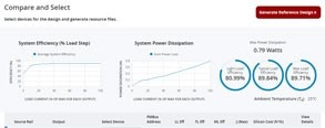 On the Compare and Select screen, graphs modeling the system efficiency and power dissipation appear at the top of the page, and the estimated system cost (based on 1k pricing) appears at the bottom of the output table. If you selected multiple parts for an output in the previous step, you'll see a drop-down menu that allows you to switch parts. As you select parts, these summary graphs and costs will dynamically update.